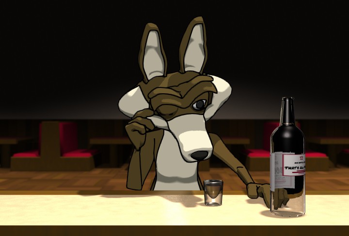 Road Runner Blues. This is an example of cel shading in LightWave. I used the "Unreal" shader for this still. I've always wondered if Wyle E. ever came to terms with the fact that he could never, ever catch the Roadrunner. I assume, as this image suggests, that he drowned his sorrows in shots of Root Beer. |